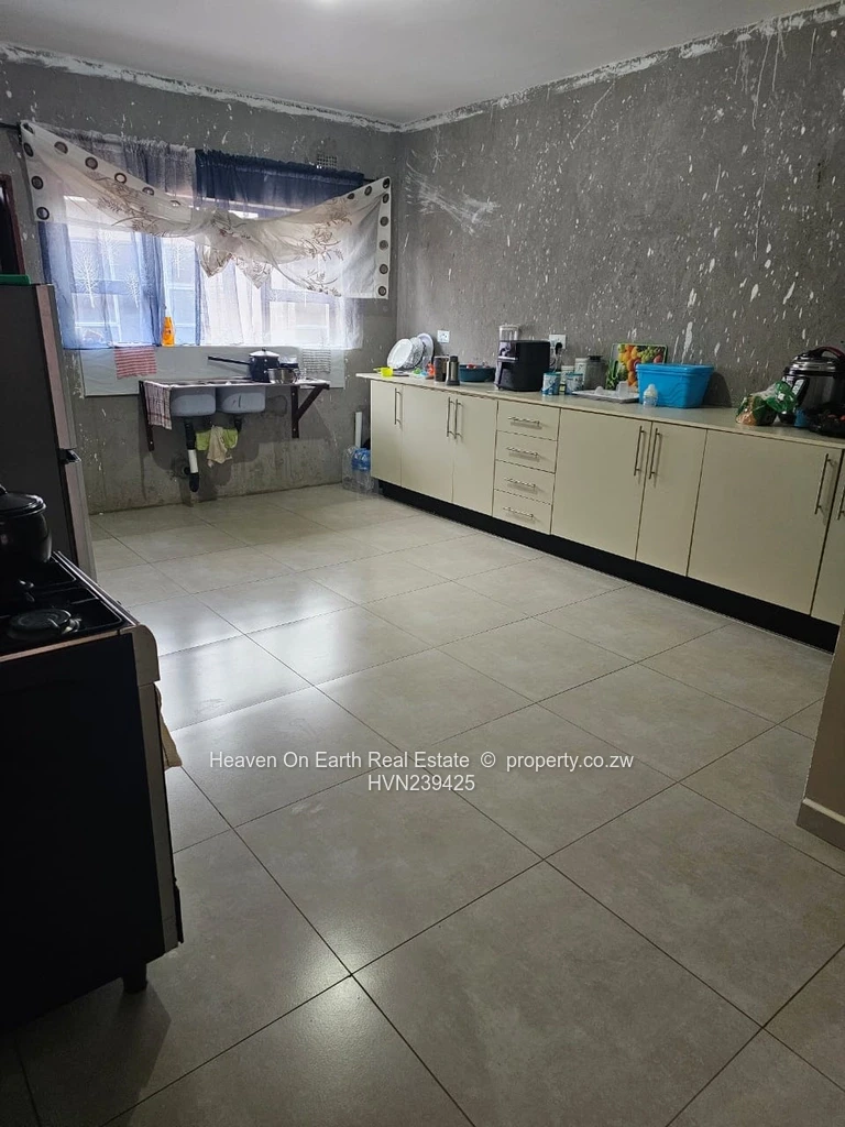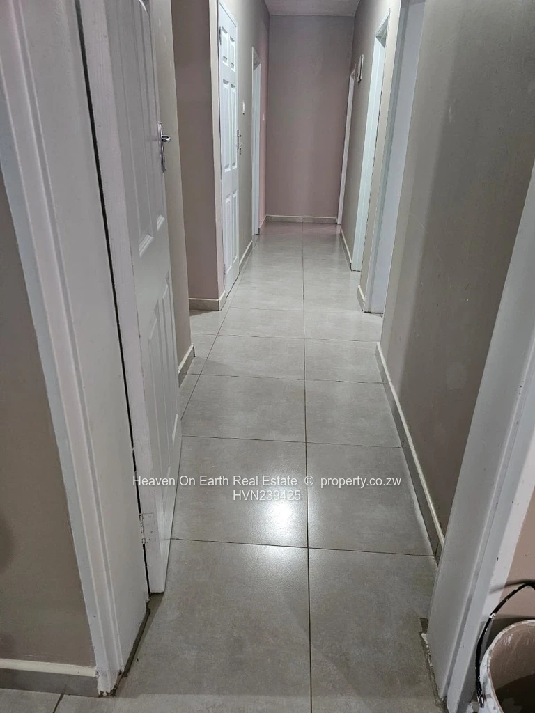 Inside you’ll find large-format floor tiles throughout and an open-plan lounge with full-height windows dressed with curtains that flood the space with natural light. The kitchen offers generous workspace — ideal for everyday living. Both bathrooms are fully tiled with quality sanitary ware; the main bedroom includes a private en suite. The property is connected to municipal water, sewer system and benefits from good ZESA supply.